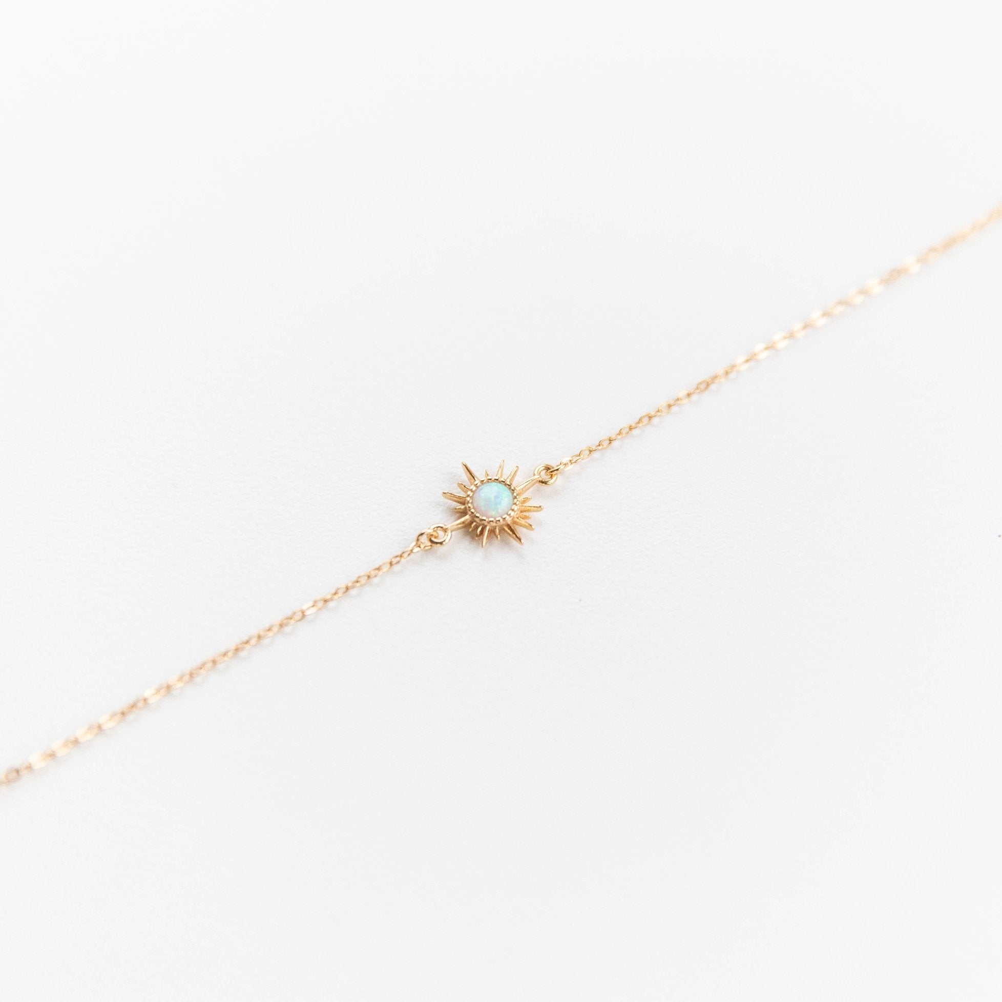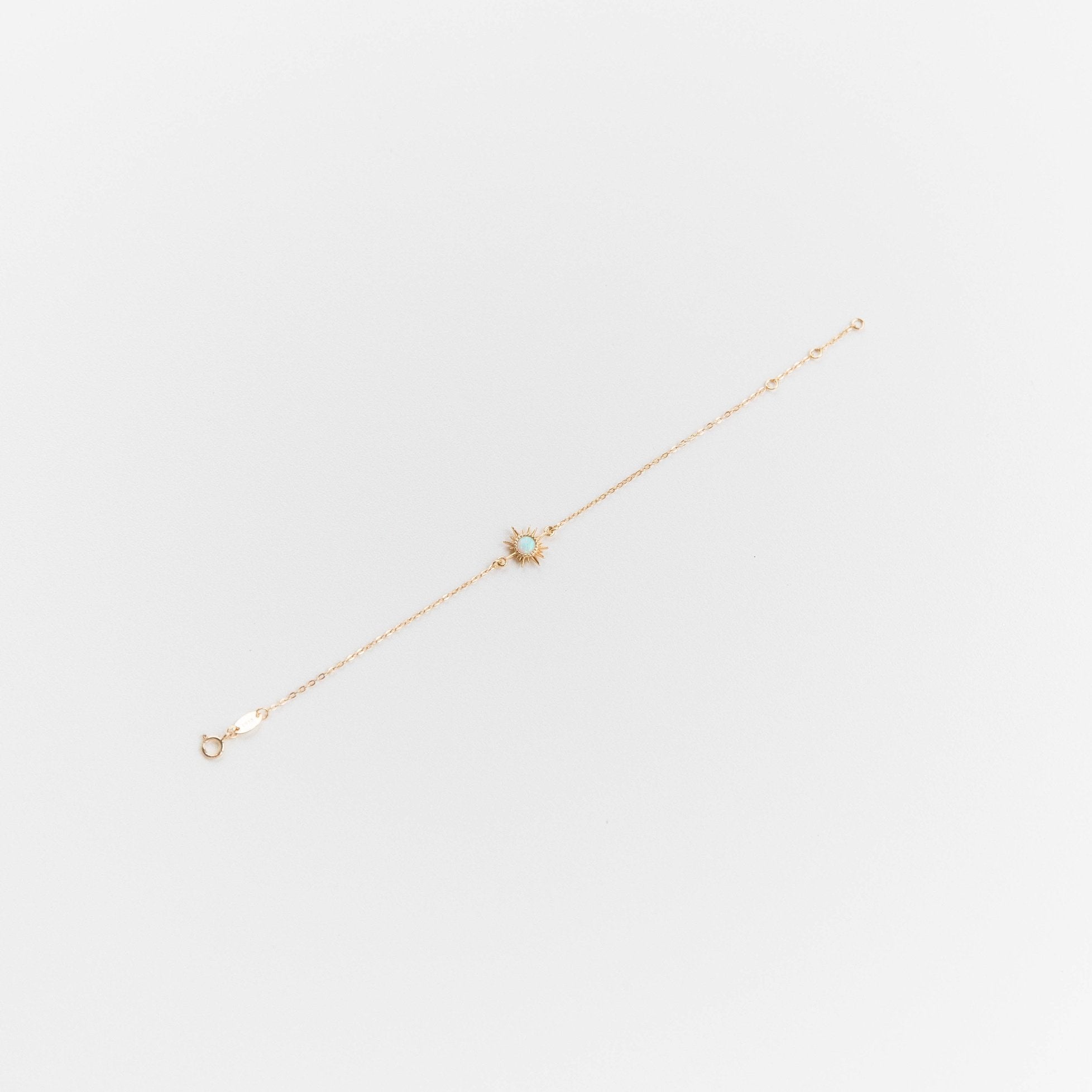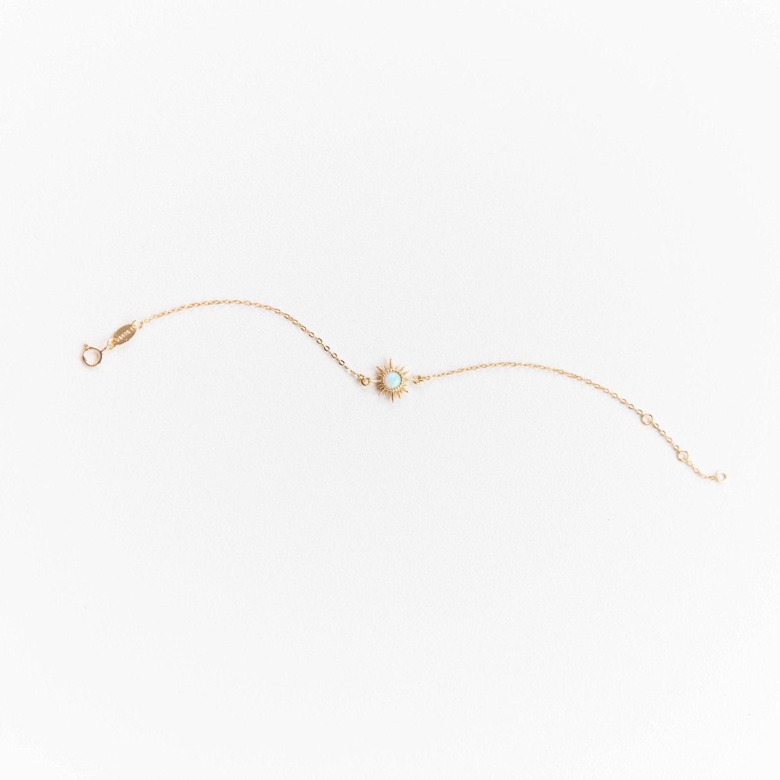 A small opal sun charm tightly fixed in a gold plated on 925 sterling silver vermeil bracelet chain. The chain is adjustable from 6", 6.5", and 7" lengths.