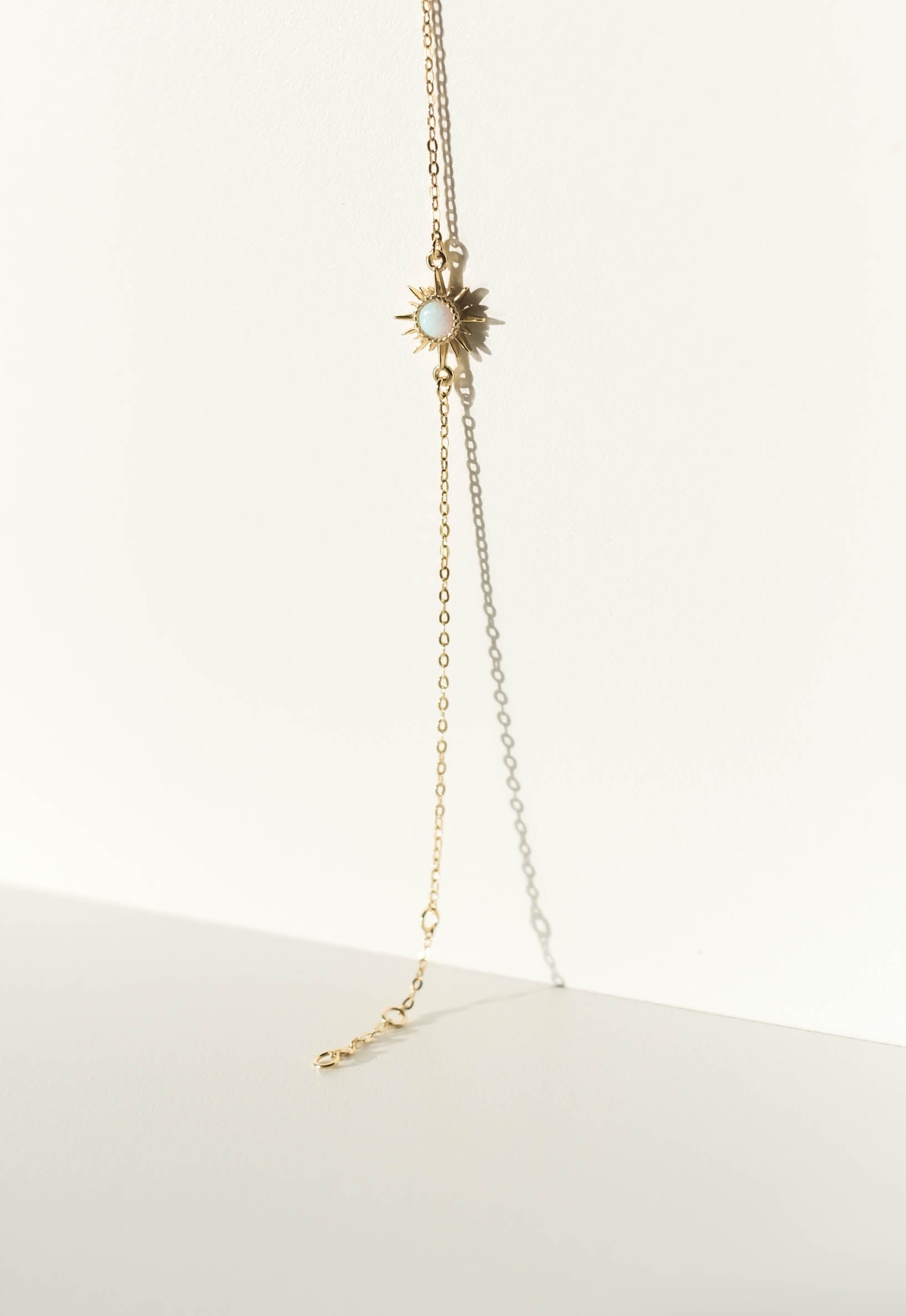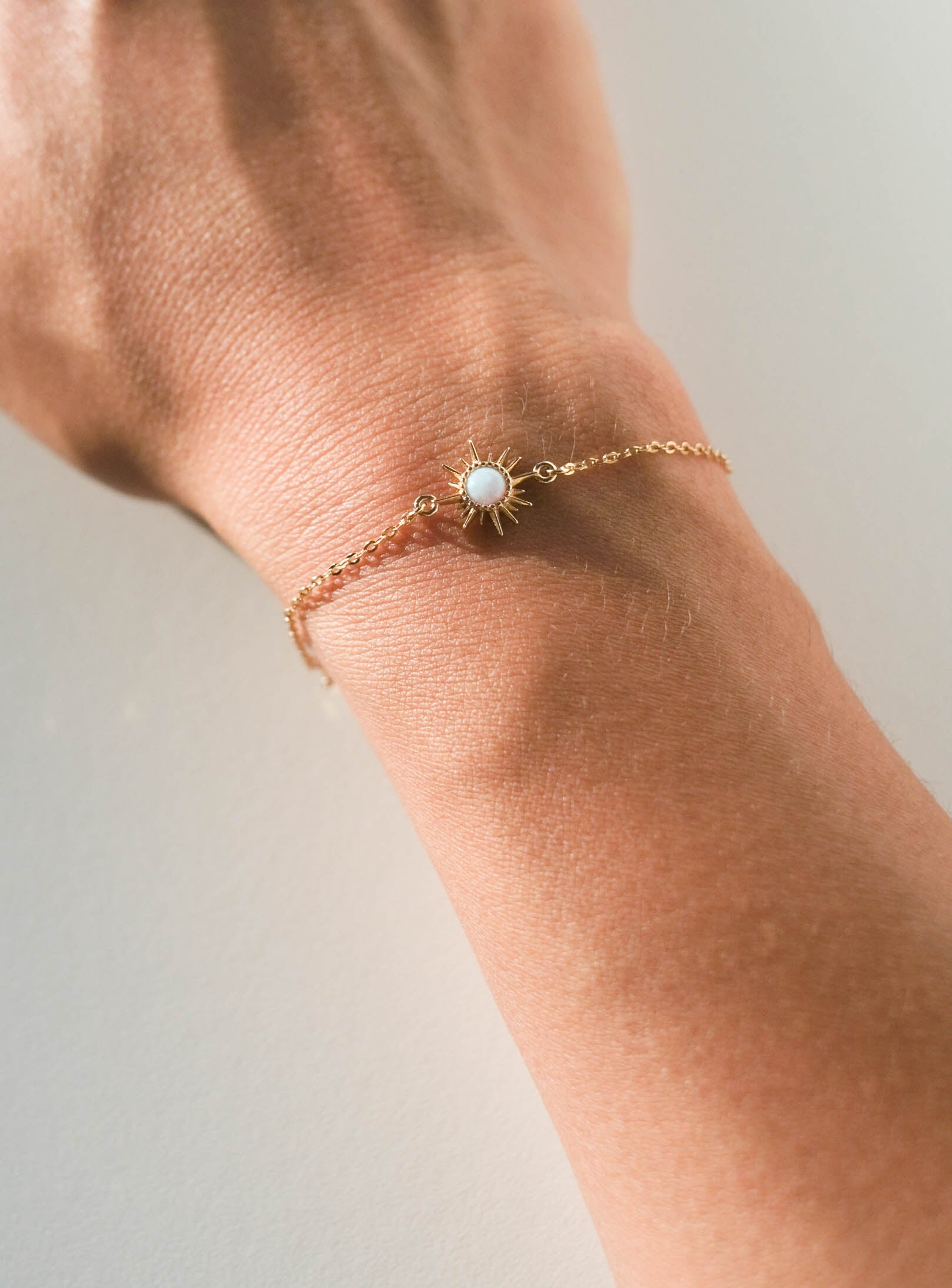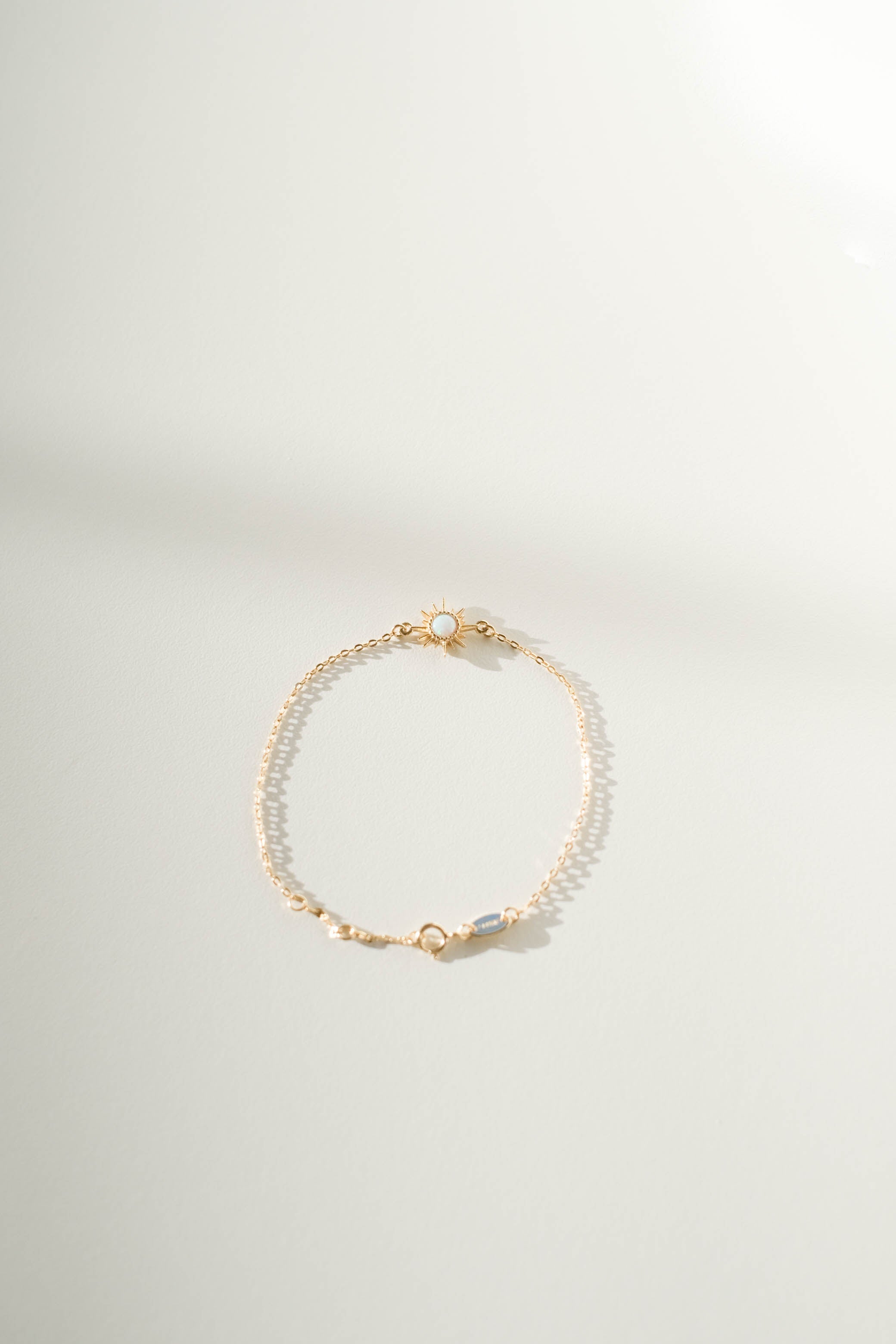 A small opal sun charm tightly fixed in a gold plated on 925 sterling silver vermeil bracelet chain. The chain is adjustable from 6", 6.5", and 7" lengths.