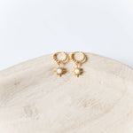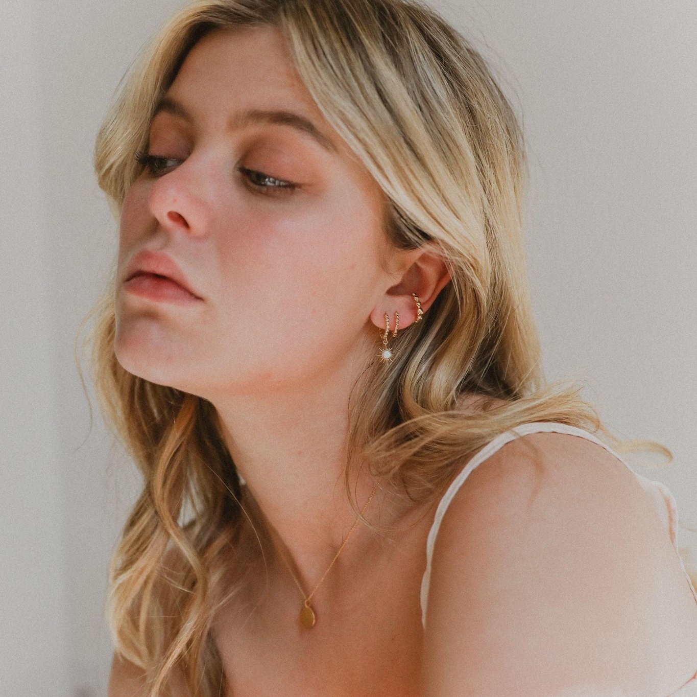 Effortless, gorgeous beaded huggies with the stunning cyra opal sun charm pendant. Perfect to add to your ear party, or as a subtle statement on their own.