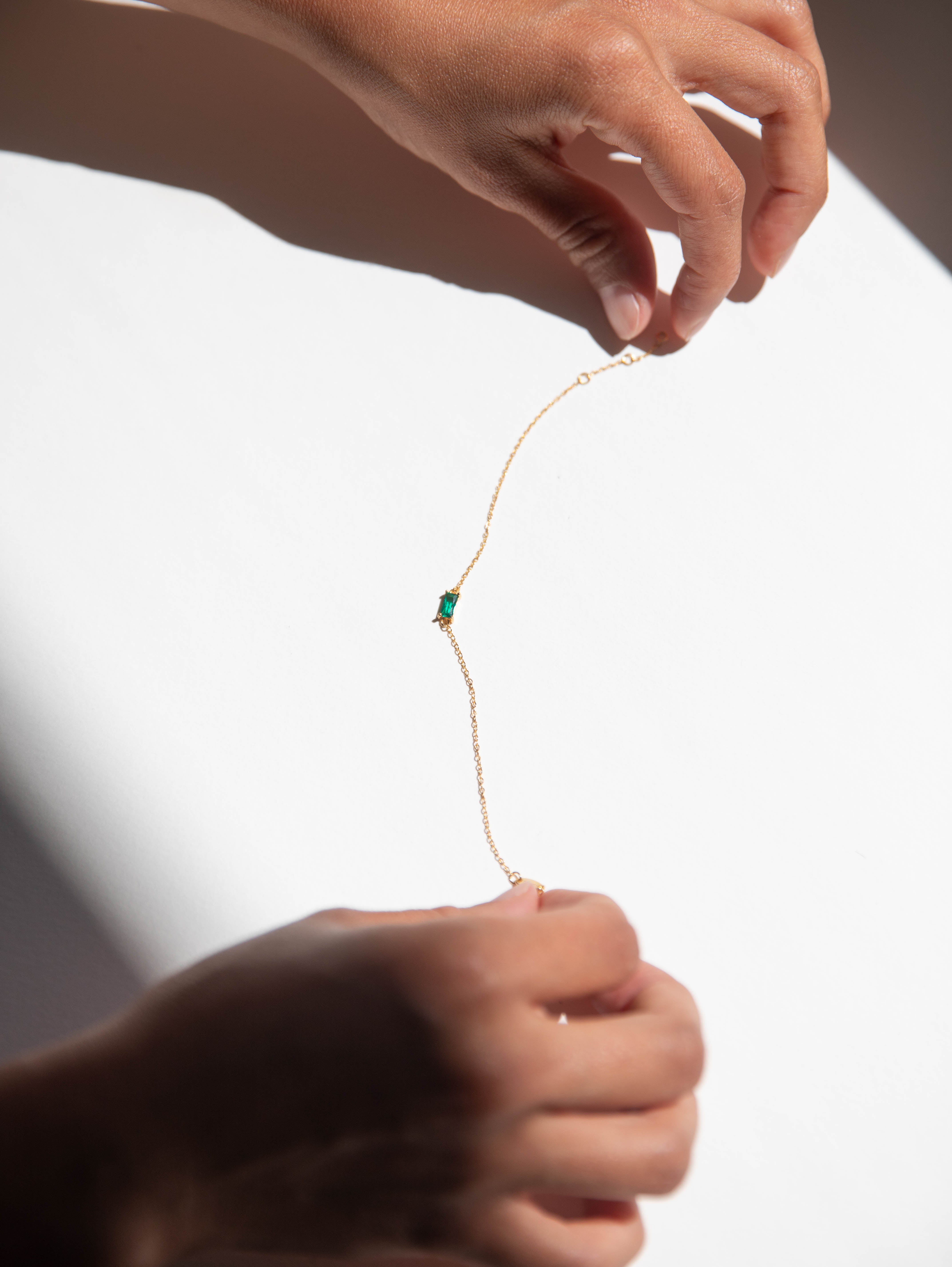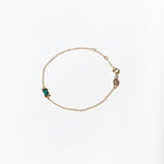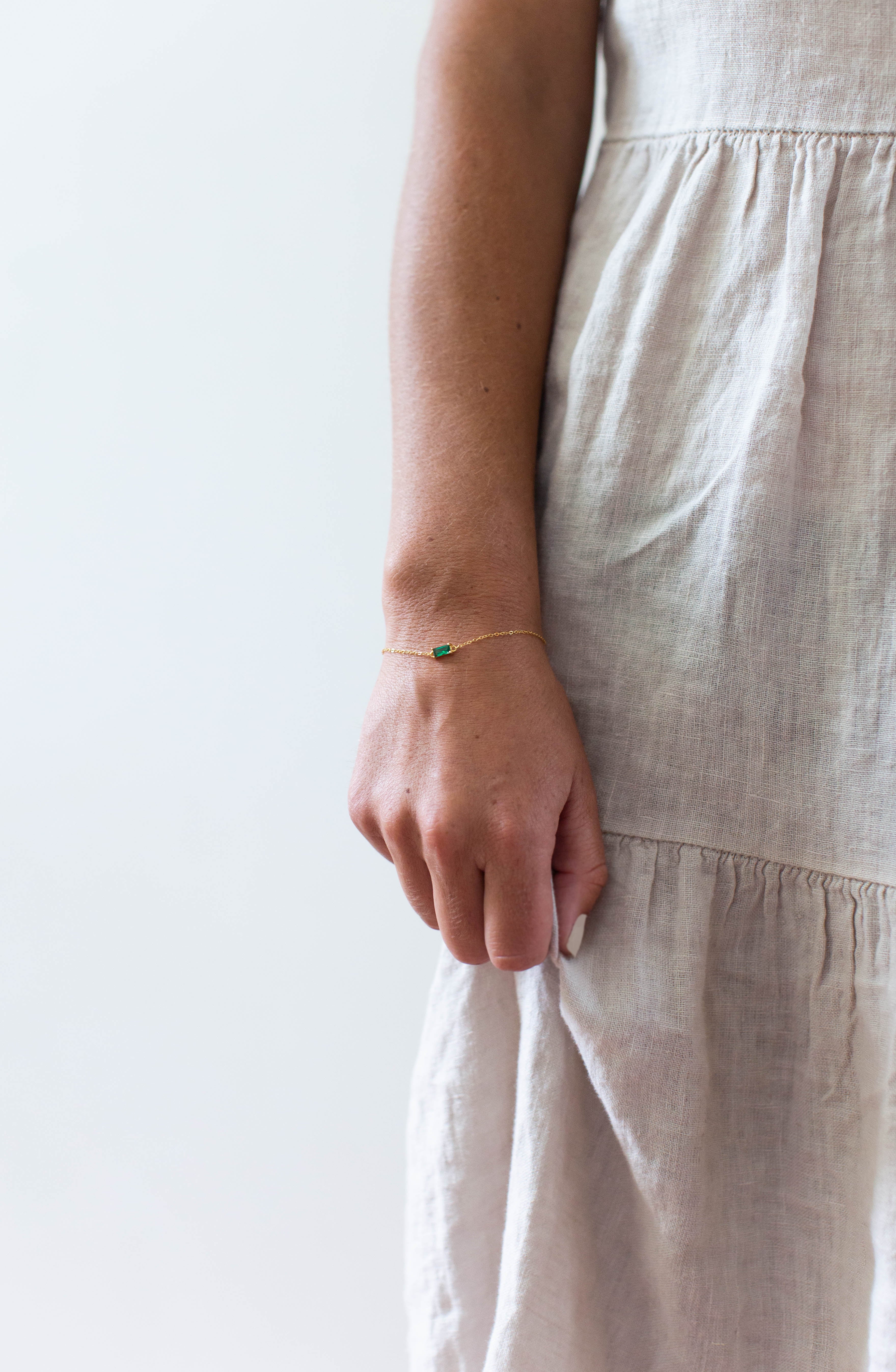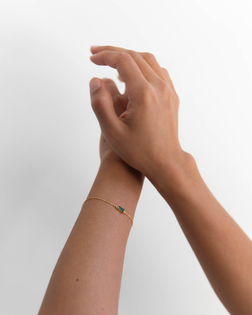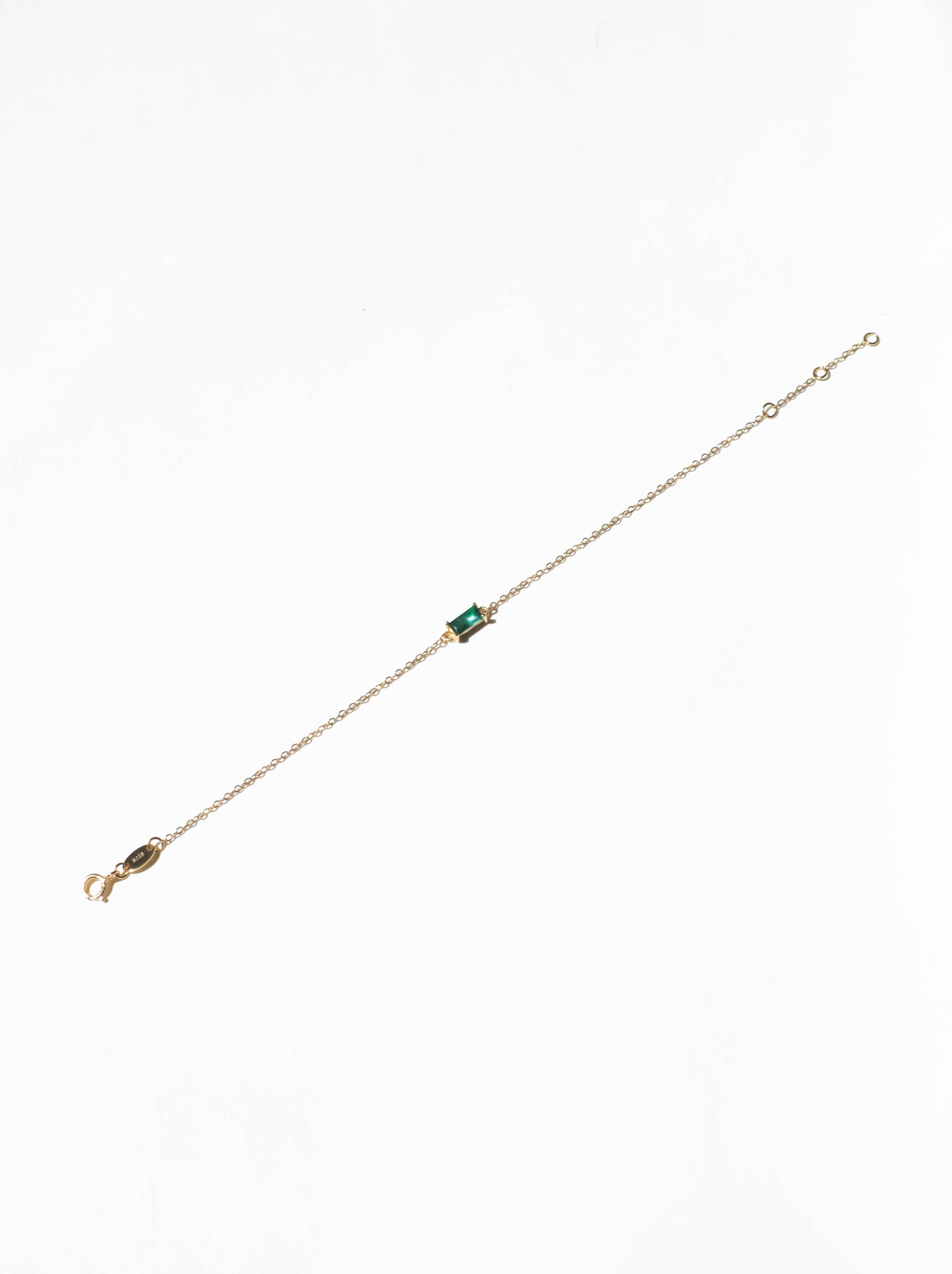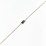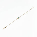A tiny square emerald green charm, tightly clamped in a gold setting. A truly stunning dainty but sturdy bracelet.