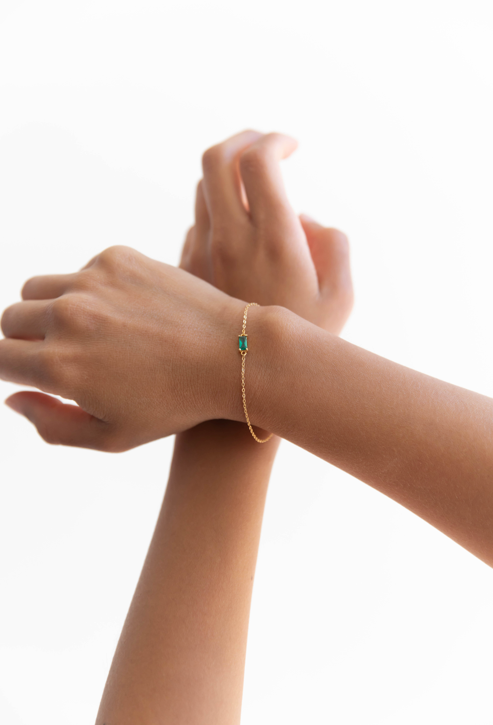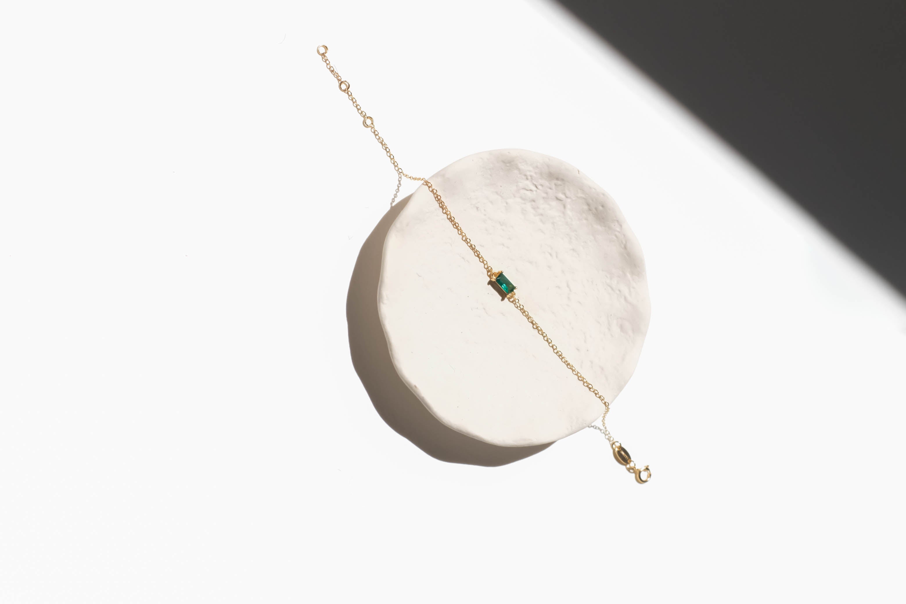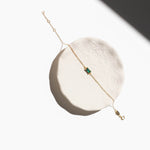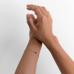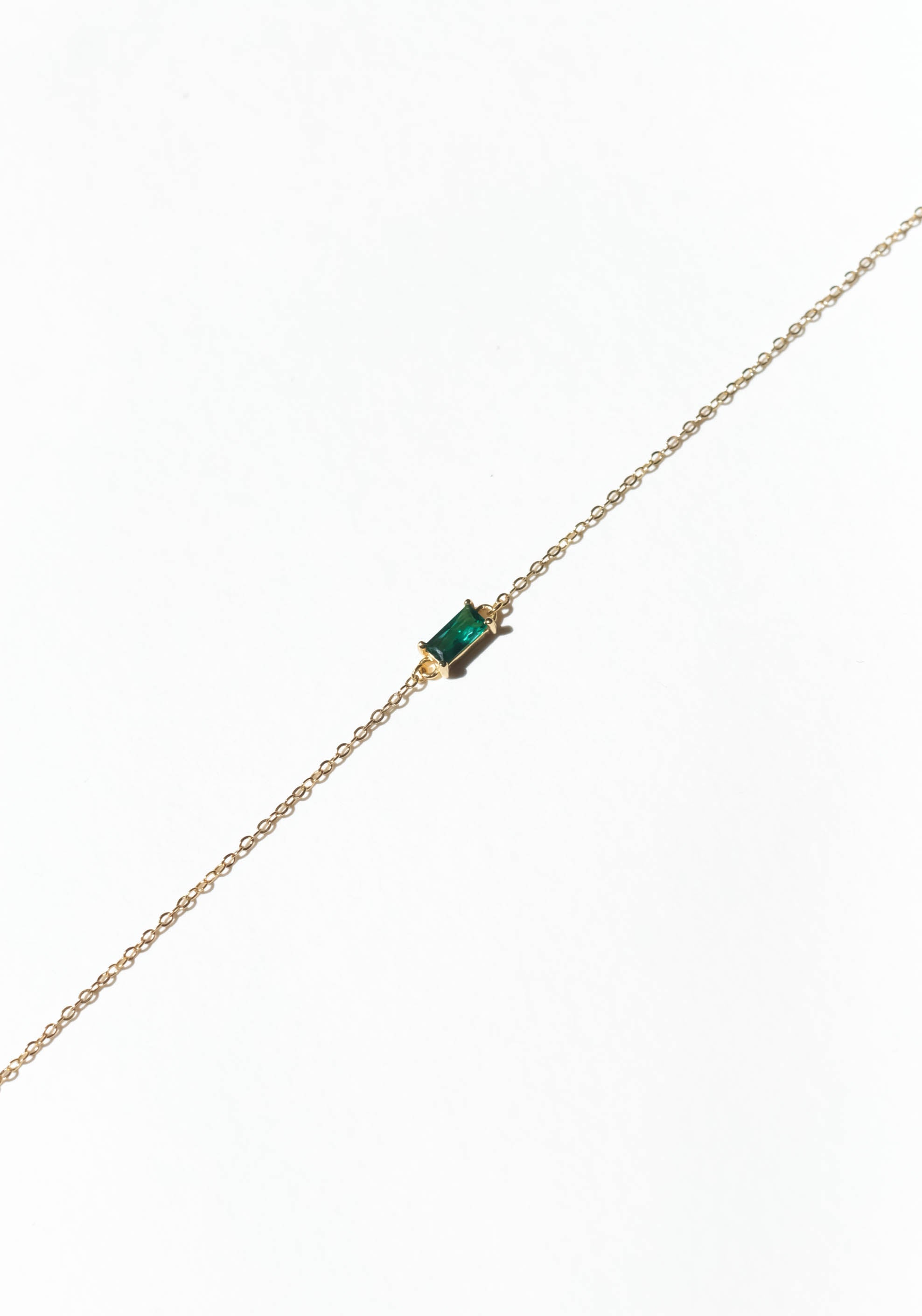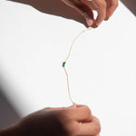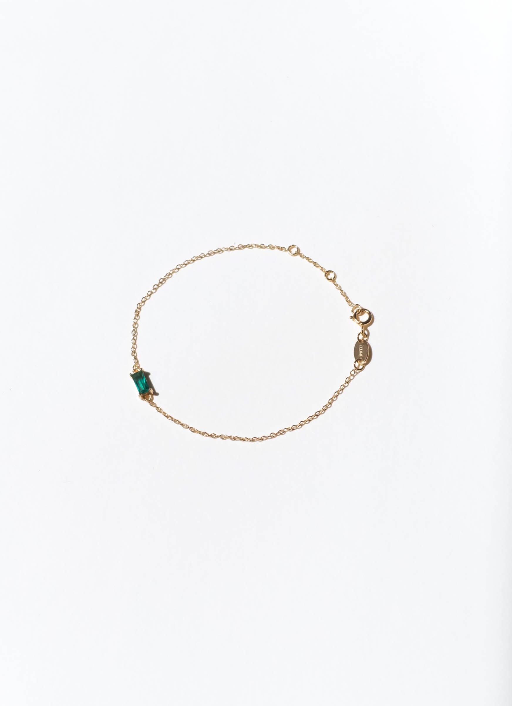 A tiny square emerald green charm, tightly clamped in a gold setting. A truly stunning dainty but sturdy bracelet.