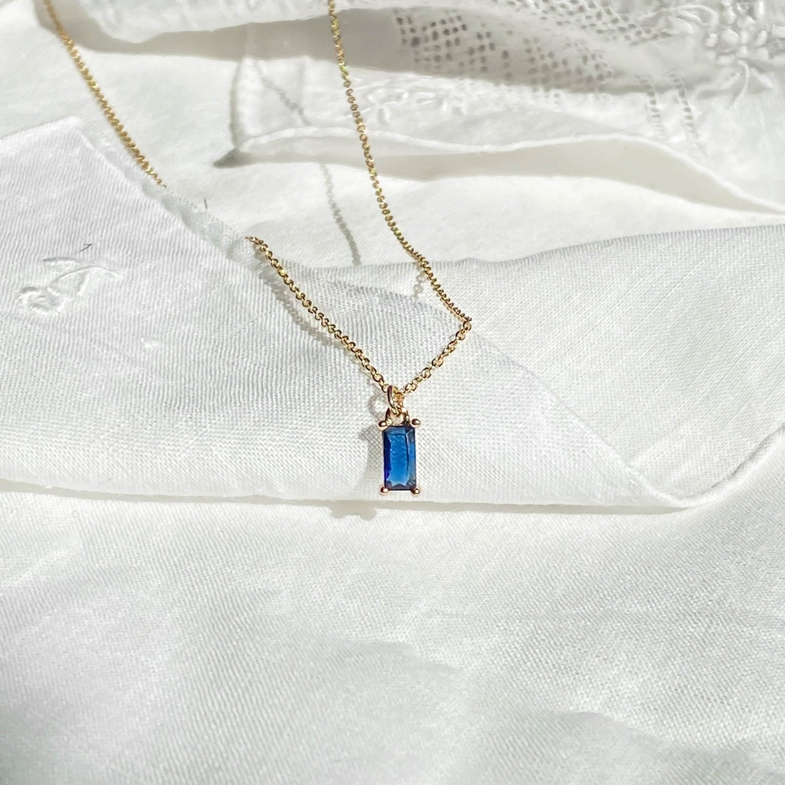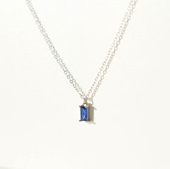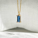 The necklace is a dainty tiny deep blue charm, tightly clamped in a gold setting.